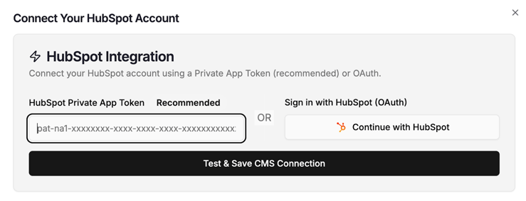 - If you sign in with PAT, you can click Test & Save CMS Connection to connect your hubspot account.