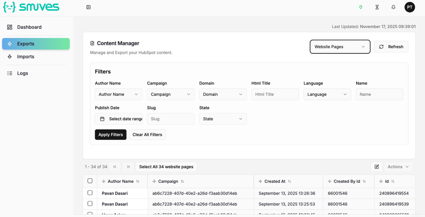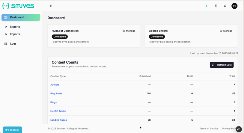 Smuves is a bulk editing tool designed for teams managing HubSpot CMS. It connects your HubSpot CMS to Google Sheets, enabling you to view, edit, and push updates for thousands of records: pages, blog posts, redirects, tags, authors, and HubDB rows without writing code or losing track of edits. Smuves is especially built to eliminate manual update bottlenecks and risks in HubSpot.