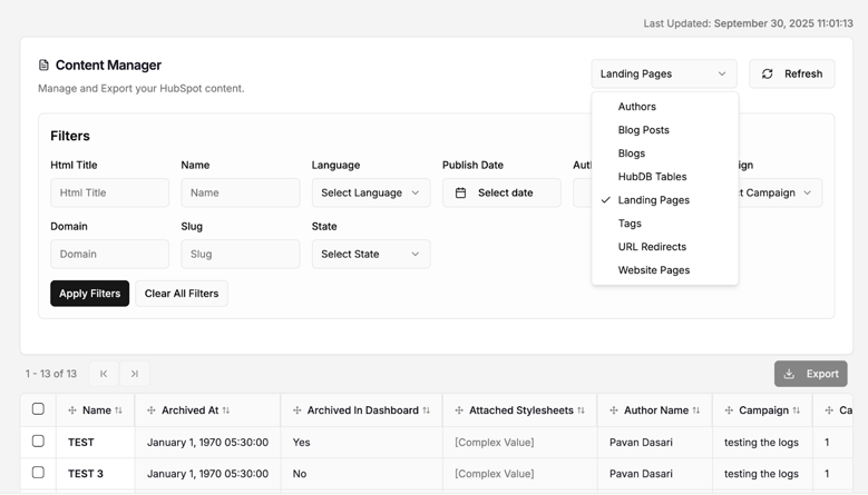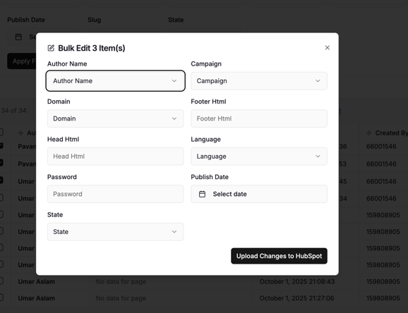 Bulk-edit pages, blog posts, authors, tags, redirects, and HubDB tables.